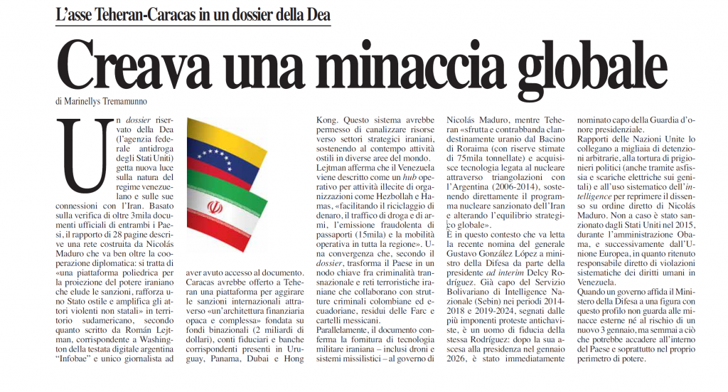Un dossier riservato della Dea (l’agenzia federale antidroga degli Stati Uniti) getta nuova luce sulla natura del regime venezuelano e sulle sue connessioni con l’Iran. Basato sulla verifica di oltre 3mila documenti ufficiali di entrambi i Paesi, il rapporto di 28 pagine descrive una rete costruita da Nicolás Maduro che va ben oltre la cooperazione diplomatica: si tratta di «una piattaforma poliedrica per la proiezione del potere iraniano che elude le sanzioni, rafforza uno Stato ostile e amplifica gli attori violenti non statali» in territorio sudamericano, secondo quanto scritto da Román Lejtman, corrispondente a Washington della testata digitale argentina “Infobae” e unico giornalista ad aver avuto accesso al documento. Caracas avrebbe offerto a Teheran una piattaforma per aggirare le sanzioni internazionali attraverso «un’architettura finanziaria opaca e complessa» fondata su fondi binazionali (2 miliardi di dollari), conti fiduciari e banche corrispondenti presenti in Uruguay, Panama, Dubai e Hong Kong. Questo sistema avrebbe permesso di canalizzare risorse verso settori strategici iraniani, sostenendo al contempo attività ostili in diverse aree del mondo. Lejtman afferma che il Venezuela viene descritto come un hub operativo per attività illecite di organizzazioni come Hezbollah e Hamas, «facilitando il riciclaggio di denaro, il traffico di droga e di armi, l’emissione fraudolenta di passaporti (15mila) e la mobilità operativa in tutta la regione». Una convergenza che, secondo il dossier, trasforma il Paese in un nodo chiave fra criminalità transnazionale e reti terroristiche iraniane che collaborano con strutture criminali colombiane ed ecuadoriane, residui delle Farc e cartelli messicani.