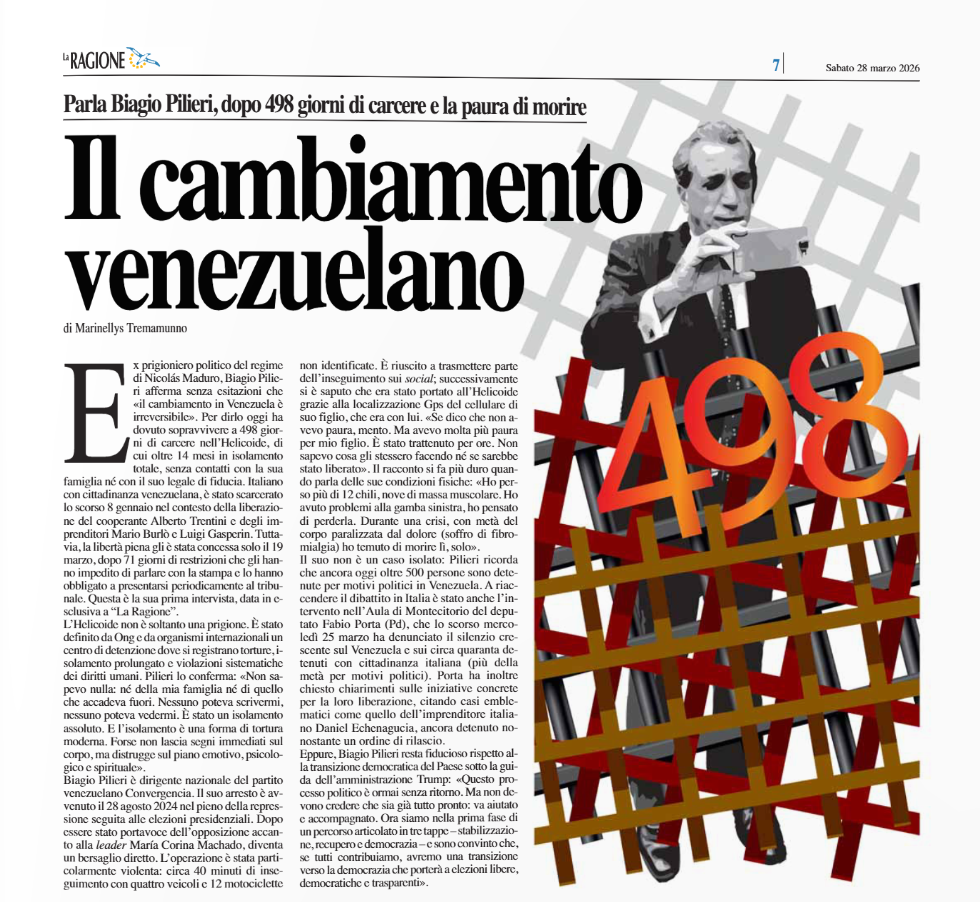 Ex prigioniero politico del regime di Nicolás Maduro, Biagio Pilieri afferma senza esitazioni che il cambiamento in Venezuela è irreversibile. Per dirlo oggi ha dovuto sopravvivere a 498 giorni di carcere nell’Helicoide, di cui oltre 14 mesi in isolamento totale, senza contatti con la sua famiglia né con il suo legale di fiducia. Italiano con cittadinanza venezuelana, è stato scarcerato lo scorso 8 gennaio nel contesto della liberazione del cooperante Alberto Trentini e degli imprenditori Mario Burolo e Luigi Gasparri. Tuttavia, la libertà piena gli è stata concessa solo il 19 marzo, dopo 71 giorni di restrizioni che gli hanno impedito di parlare con la stampa e lo hanno obbligato a presentarsi periodicamente al tribunale. Questa è la sua prima intervista, data in esclusiva a “La Ragione”.