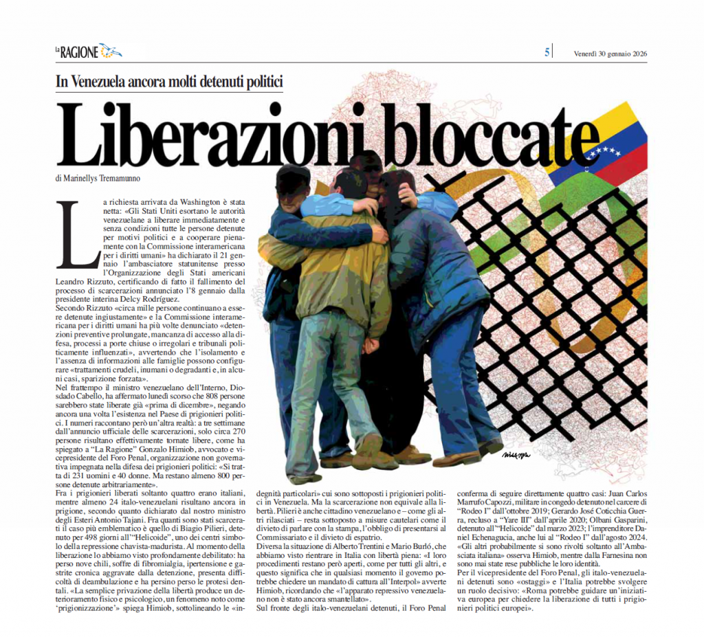 Per il vicepresidente del Foro Penal, gli italo-venezuelani detenuti sono «ostaggi» e l’Italia potrebbe svolgere un ruolo decisivo: «Roma potrebbe guidare un’iniziativa europea per chiedere la liberazione di tutti i prigionieri politici europei».