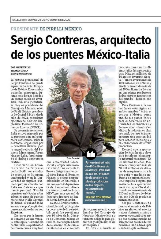 La historia profesional de Sergio Contreras no puede separarse de Italia. Tampoco de México. Entre ambos países ha construido, durante más de tres décadas, un puente sólido de inversión, industria y confianza. Hoy es presidente del Consejo de Administración de Pirelli México, presidente de Capital It Mx y, desde julio de 2024, presidente ejecutivo del Consejo Empresarial Mexicano de Comercio Exterior (COMCE). Su presencia reciente en Italia estuvo marcada por su participación en la primera conferencia sobre la Italofonia, organizada por la cancillería italiana, y en la segunda edición del “Business & Investment Forum México-Italia”, fortaleciendo el diálogo económico bilateral.